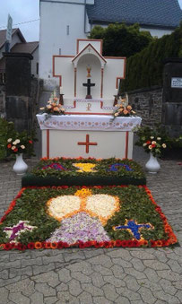 Alle zwei Jahre ist es zudem die Aufgabe des Vereins im Rahmen der Fronleichnamsprozession in der Nachbargemeinde Langenfeld einen Altar herzurichten und einen Blumenteppich zu legen. Dazu sammeln die Junggesellen schon ein bis zwei Tage vorher Blumen für diesen und überlegen sich, welches Motiv die Teilnehmer der Fronleichnamsprozession wieder einmal begeistern soll. Früh morgens an Fronleichnam wird dann der Altar von den Mitgliedern des Vereins aufgebaut und mit einem Blumenteppich versehen.